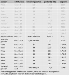 In Genesis wordt niet de gehele mensheid chronologisch gevolgd. Alleen in de lijn waarlangs Gods belofte loopt, worden leeftijden en perioden vermeld. In Genesis 5 worden tien generaties genoemd, van Adam tot Noach, met telkens zowel de verwekkingsleeftijd als de resterende levensduur. In Genesis 11 zien we hetzelfde patroon terug in de lijn van Sem tot Abraham. Deze gegevens vormen samen een gesloten tijdlijn.