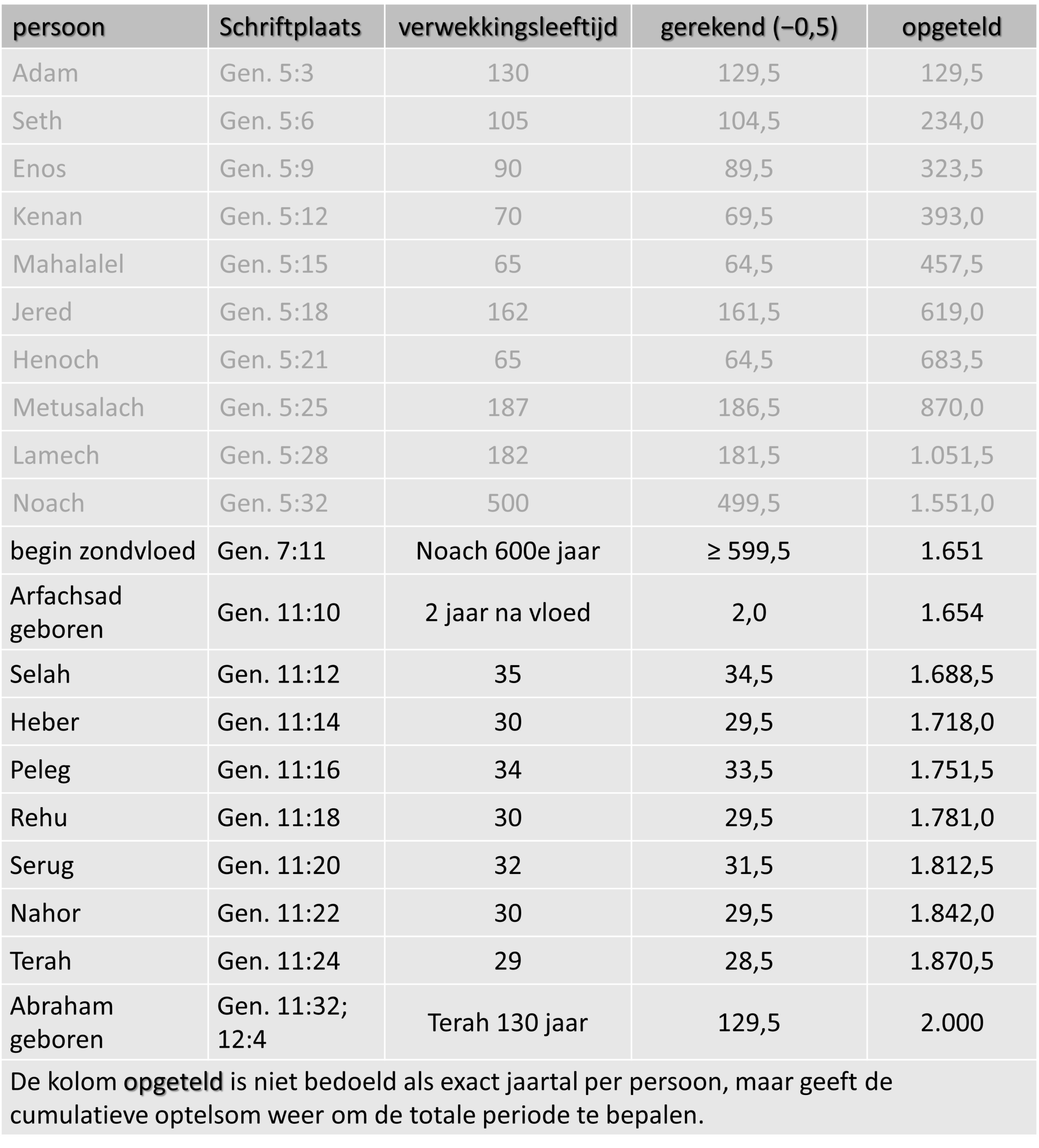 In Genesis wordt niet de gehele mensheid chronologisch gevolgd. Alleen in de lijn waarlangs Gods belofte loopt, worden leeftijden en perioden vermeld. In Genesis 5 worden tien generaties genoemd, van Adam tot Noach, met telkens zowel de verwekkingsleeftijd als de resterende levensduur. In Genesis 11 zien we hetzelfde patroon terug in de lijn van Sem tot Abraham. Deze gegevens vormen samen een gesloten tijdlijn.
