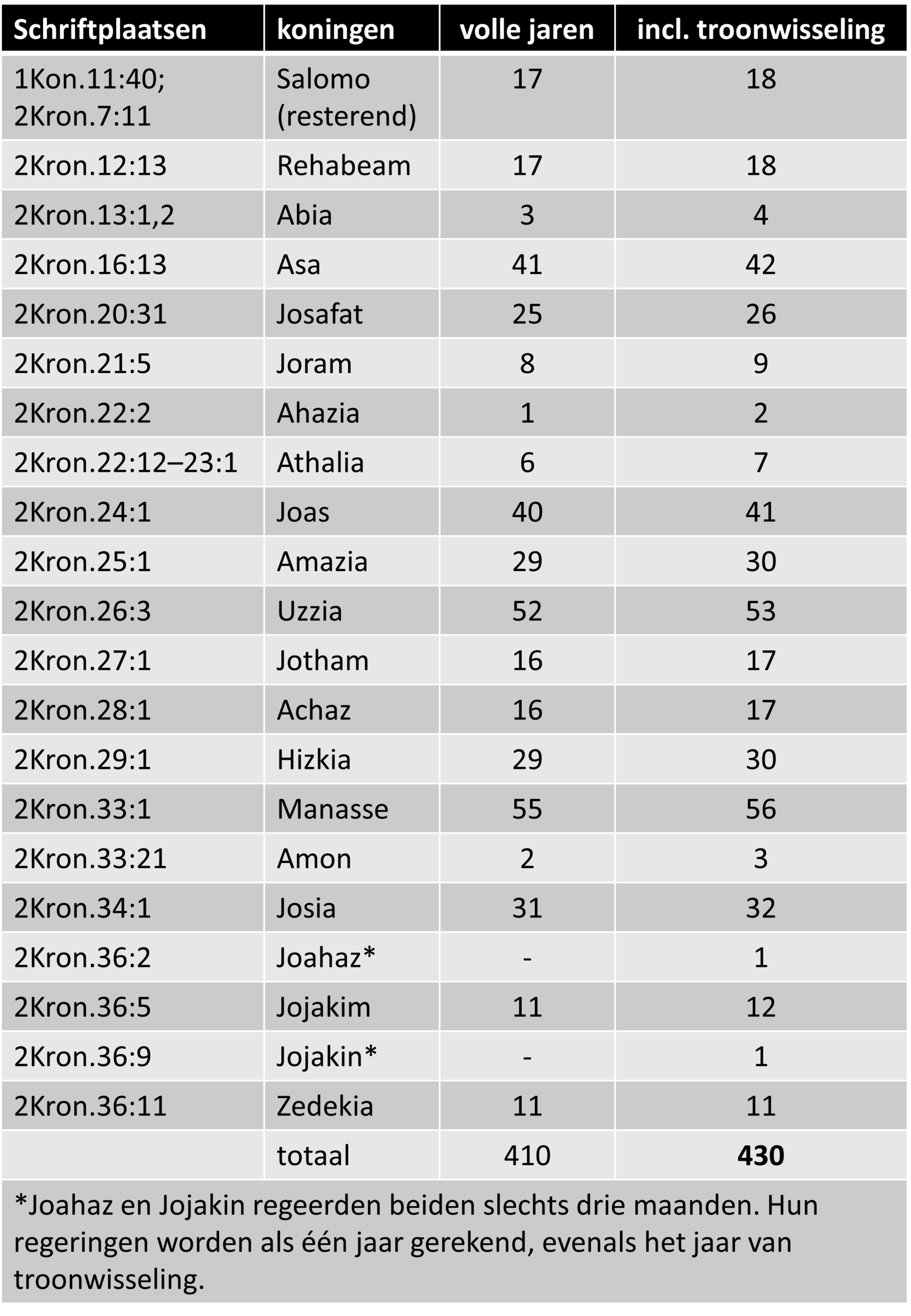De onderstaande tabel geeft deze optelling weer. Zij volgt de gegevens uit Koningen en Kronieken en laat zien hoe de regeringen elkaar opvolgen tot aan de val van Jeruzalem onder Zedekia. Ook de korte regeringen van Joahaz en Jojakin zijn hierin meegenomen, omdat zij in de Schrift expliciet als koningen worden genoemd.