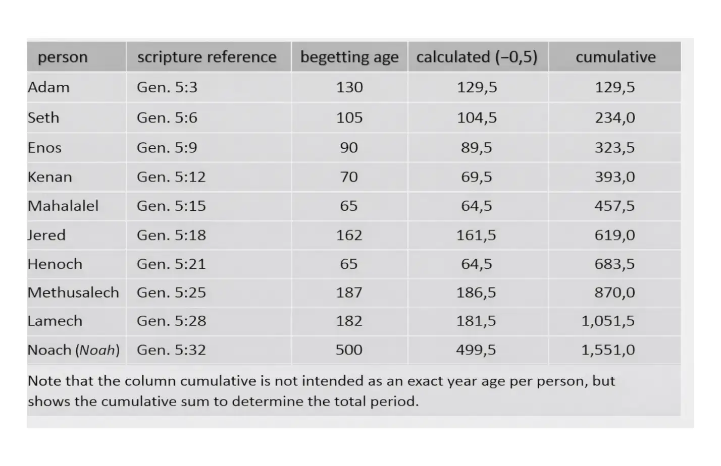 When the data of Genesis 5 are processed according to the adopted starting points, a closed timeline arises from Adam to the deluge. Ten generations are mentioned, with for each generation both the age at begetting and the remaining lifespan. There are no gaps and no overlapping lines. Scripture does not leave this period open, but delineates it completely.