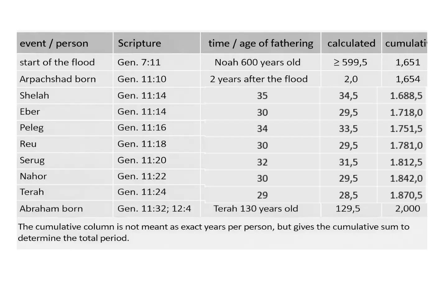 With this manner of calculation, no exact years are mentioned per generation or per patriarch. That is not a shortcoming, but a deliberate choice. The intervening years are approximated, not fixed. In this way it is prevented that a precision is assigned to individual lives which the text itself does not offer.