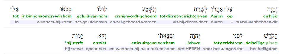 Aaron nu zal dit aanhebben, als hij dienst doet, en het geluid ervan zal gehoord worden (….) en hij niet sterve.